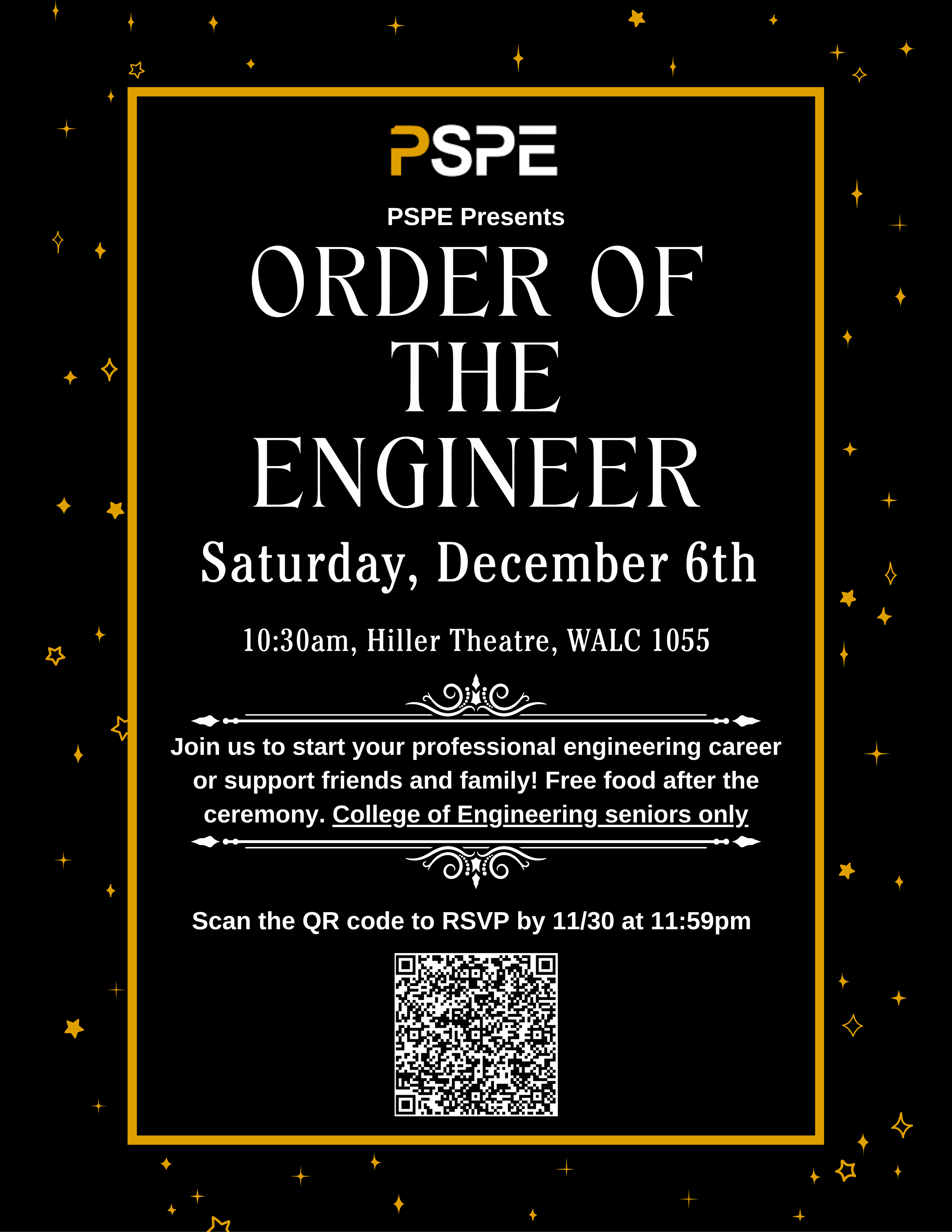 The Purdue Society of Professional Engineers is also an active organization in the school. In December and April, PSPE hosts the Order of the Engineer event for both graduating engineers and professionals. Those who participate get a ring and a certificate. For more information, including how to register, visit the Order of the Engineer Page.