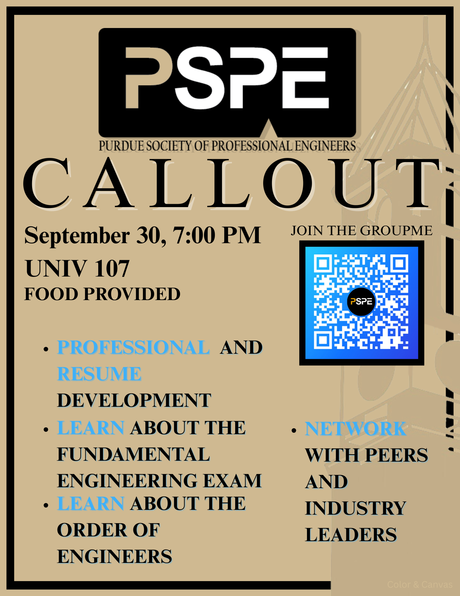 The Purdue Society of Professional Engineers is affiliated with the National Society of Professional Engineers, the Indiana Society of Professional Engineers and the AA Potter chapter in Indiana. All of these organizations have outstanding reputations and are well known in the engineering field. The goal of this organization and its parent organizations is to promote professionalism, leadership and ethics within the engineering profession.